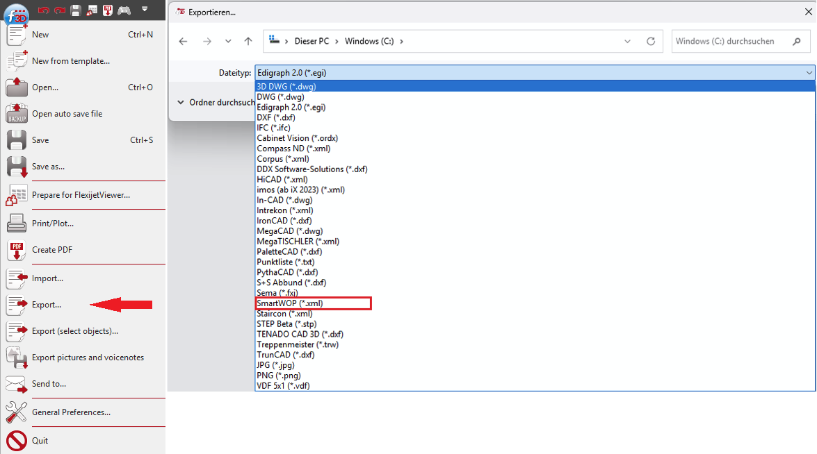 • Revision of the export dialog: The selection of various DWG, DXF and IFC formats is now available directly in the export dialog, which increases clarity.
