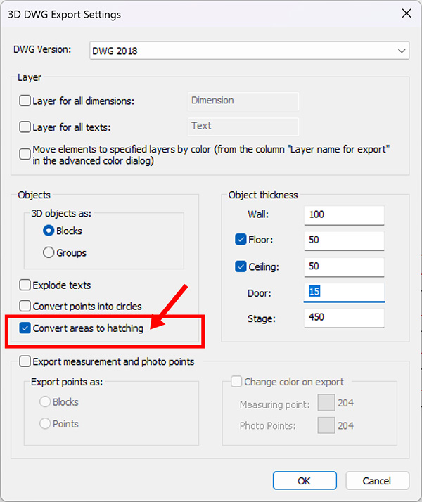 • Improved: The setting “Convert Areas to Hatching” in the export dialog now remembers your last choice. The checkbox is no longer automatically active for every export, saving you time and allowing for more consistent use of the export functions.