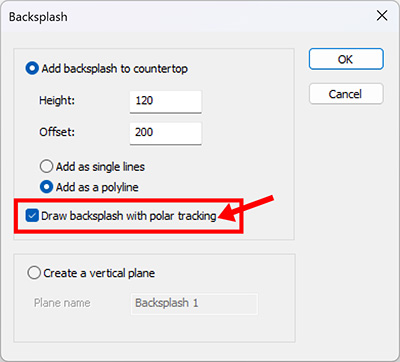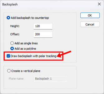 • Create Backsplash with polar tracking: Draw kitchen backsplashes with precision and ease! The ‘Backsplash’ command now supports Polar Tracking, so you can easily create kitchen backsplashes at specific angles and orientations.